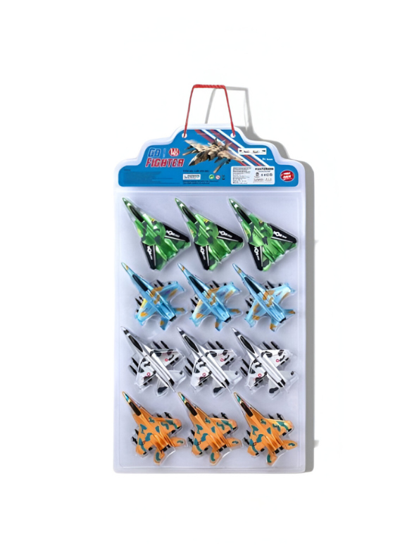 - 12-piece die-cast military fighter jet toy set featuring assorted camouflage combat aircraft