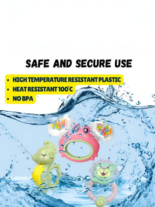 • Includes cute lion, seahorse, and crab shaker toys for early sensory play.