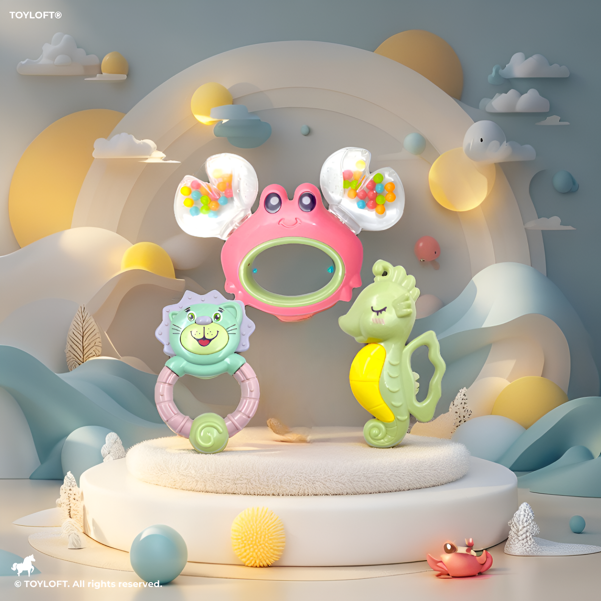 3-Piece Baby Rattle & Teether Toy Set – Lion, Seahorse & Crab Shakers for Infants, BPA-Free Sensory Toys NX12677.