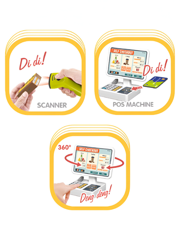 - Includes a realistic cash register with lights, sounds, and a working calculator function.