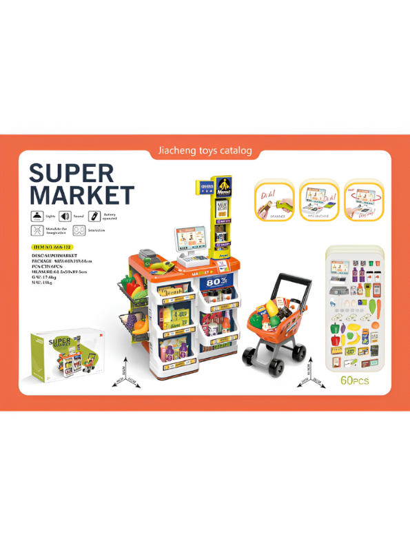 - Comes with a shopping trolley, play money, credit card, and a variety of pretend groceries.