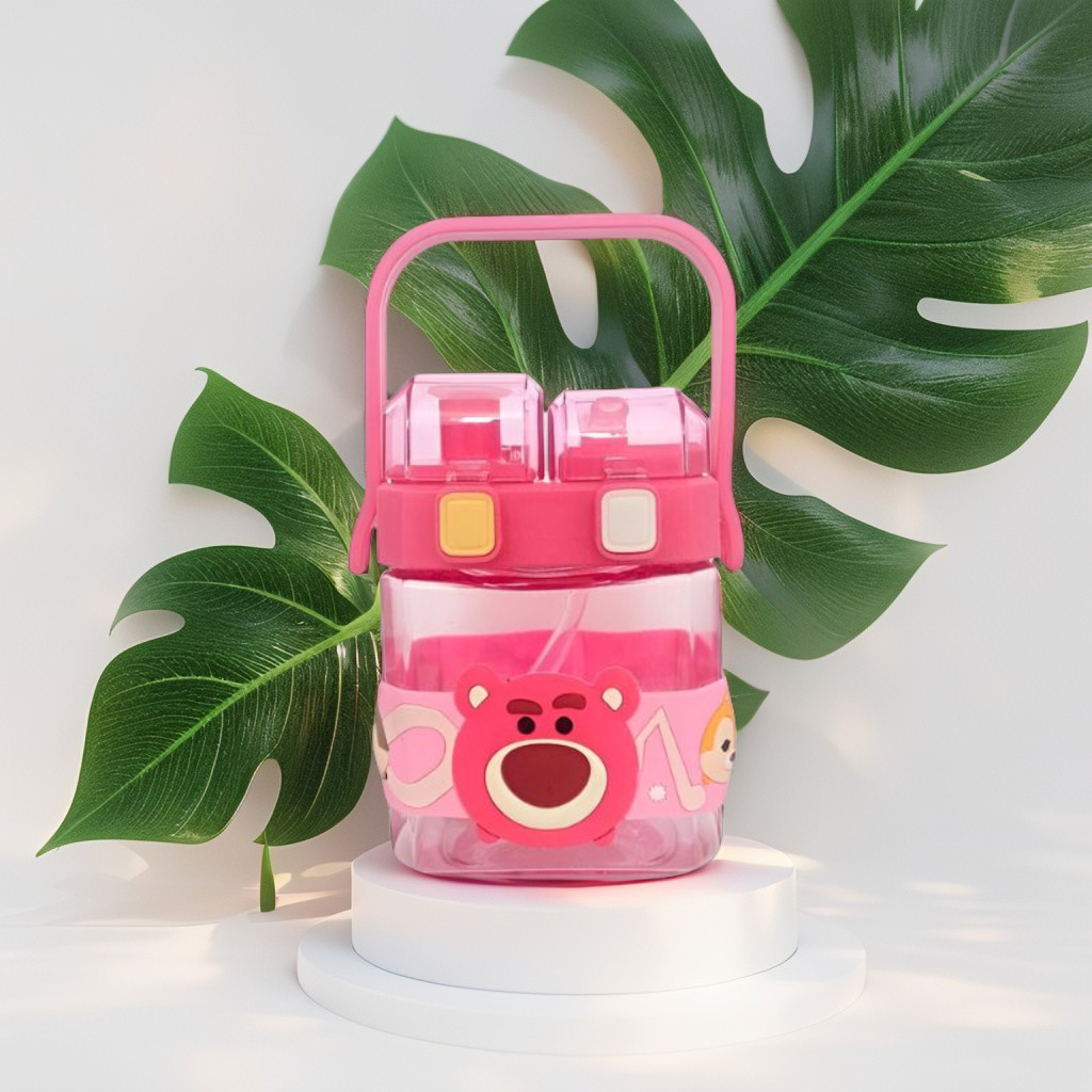 Disney Cartoon 2-in-1 Kids Water Bottle 600ml – Push Button Sipper + Straw | Leakproof Plastic Bottle with Neck Strap for School & Travel NOV10374.