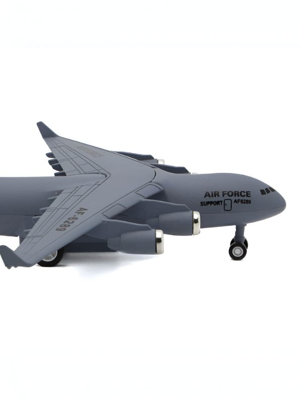 - Heavy-duty military cargo aircraft model inspired by the C-17 transport jet.