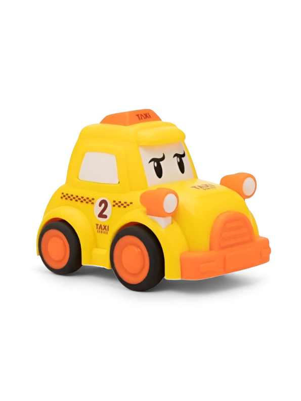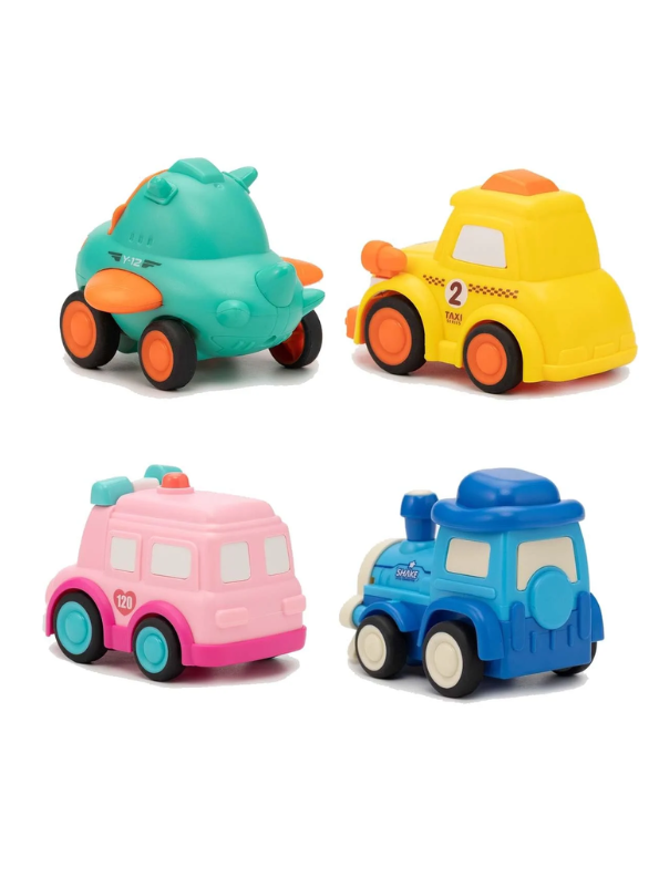- Set includes four pull-back vehicles: Taxi, Ambulance, Train, and Monster Car.