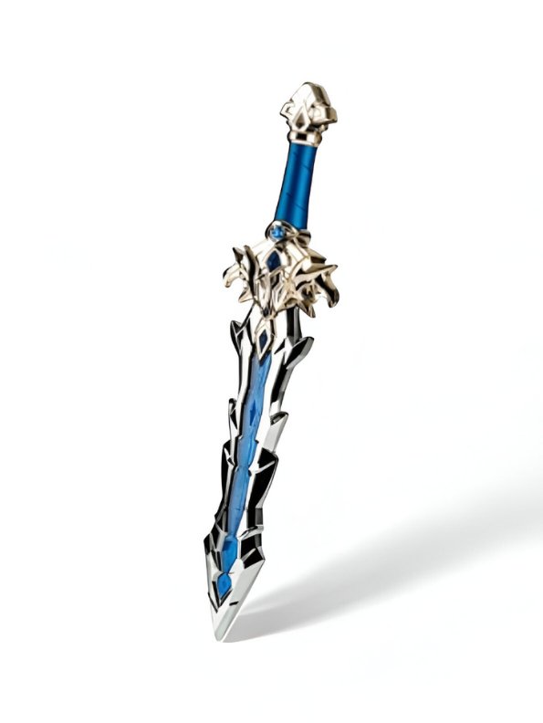 - Exquisitely detailed miniature sword featuring a striking blue and silver spiked blade design