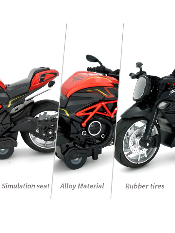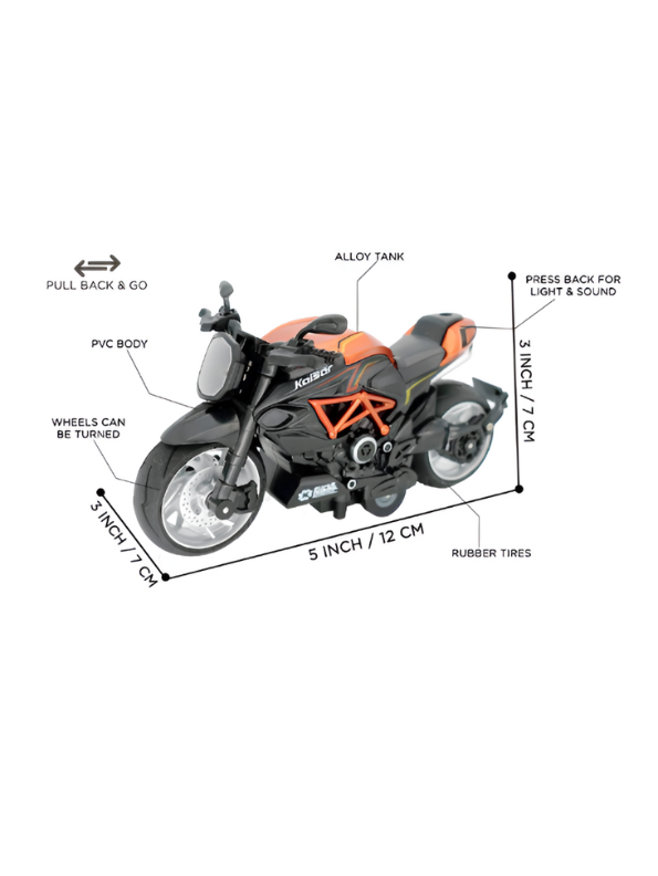 - Diecast Pull Back Bike – Durable metal body provides realistic look and long-lasting play.