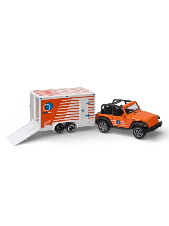 • Orange miniature off-road SUV toy paired with a matching truck and trailer set for adventure play.
