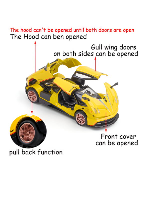 - Precision-molded exterior captures the iconic curves and styling of the Pagani Huayra.