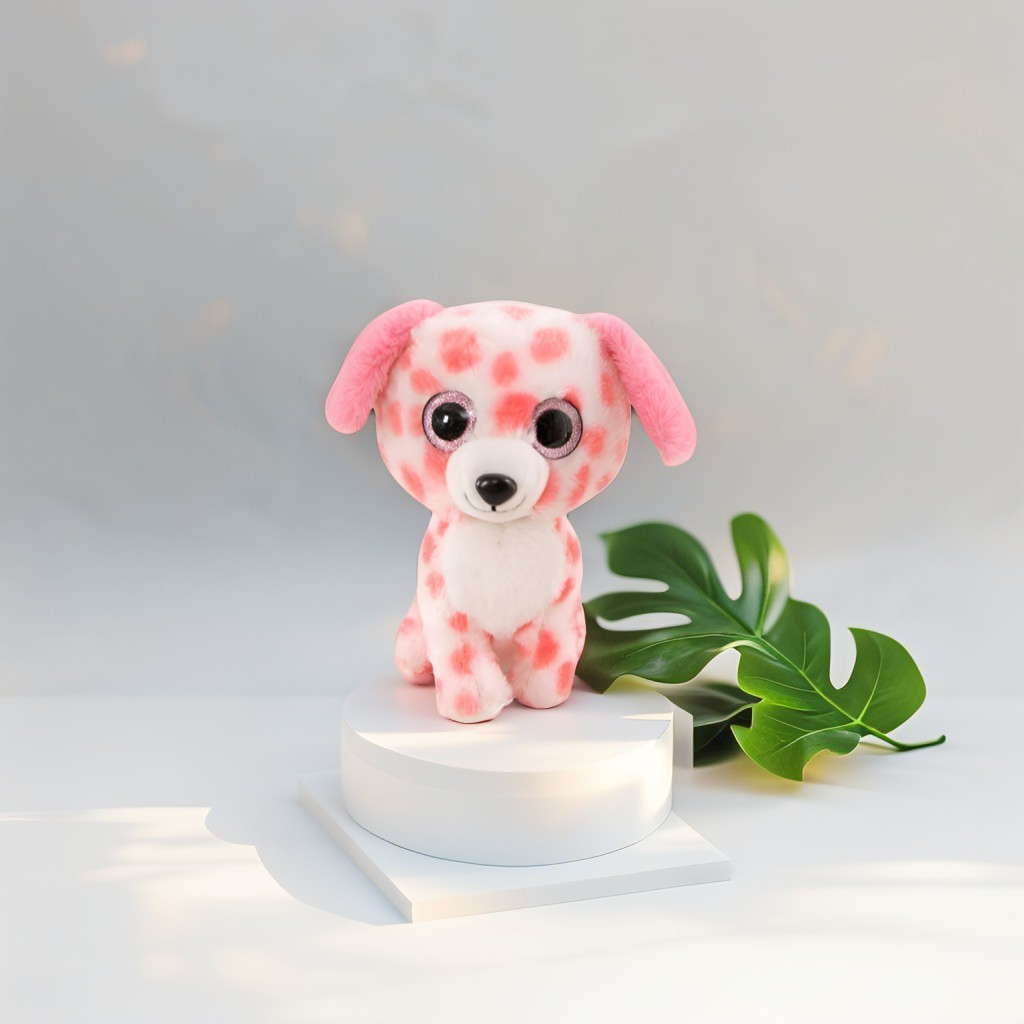 - Adorable pink and white spotted dog plush with oversized eyes for a charming and lovable appearance