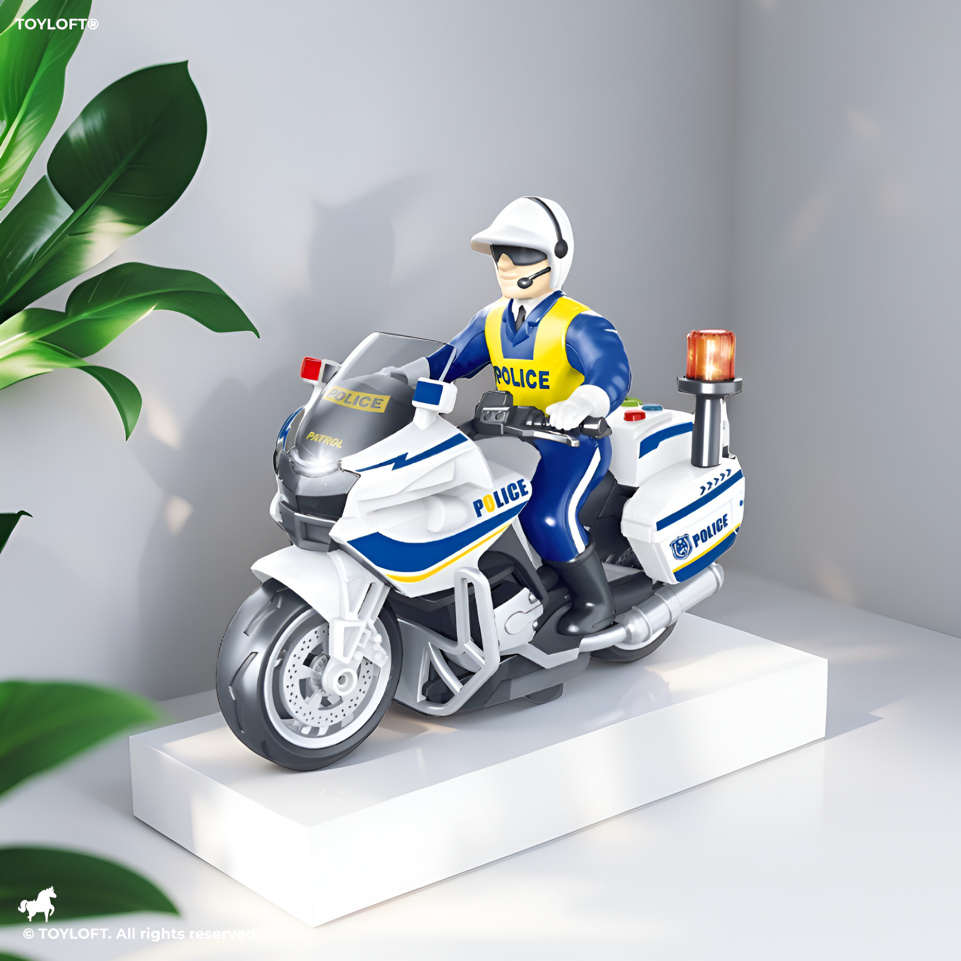 - Equipped with flashing lights that simulate a real police motorbike in action.
