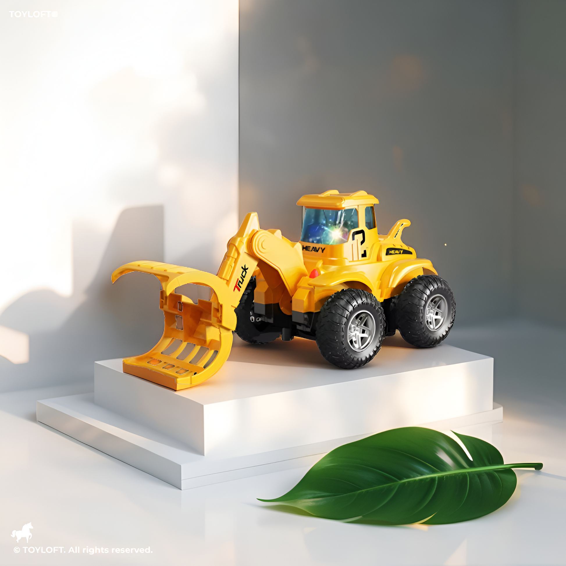 - Yellow RC loader truck suitable for indoor and outdoor use.