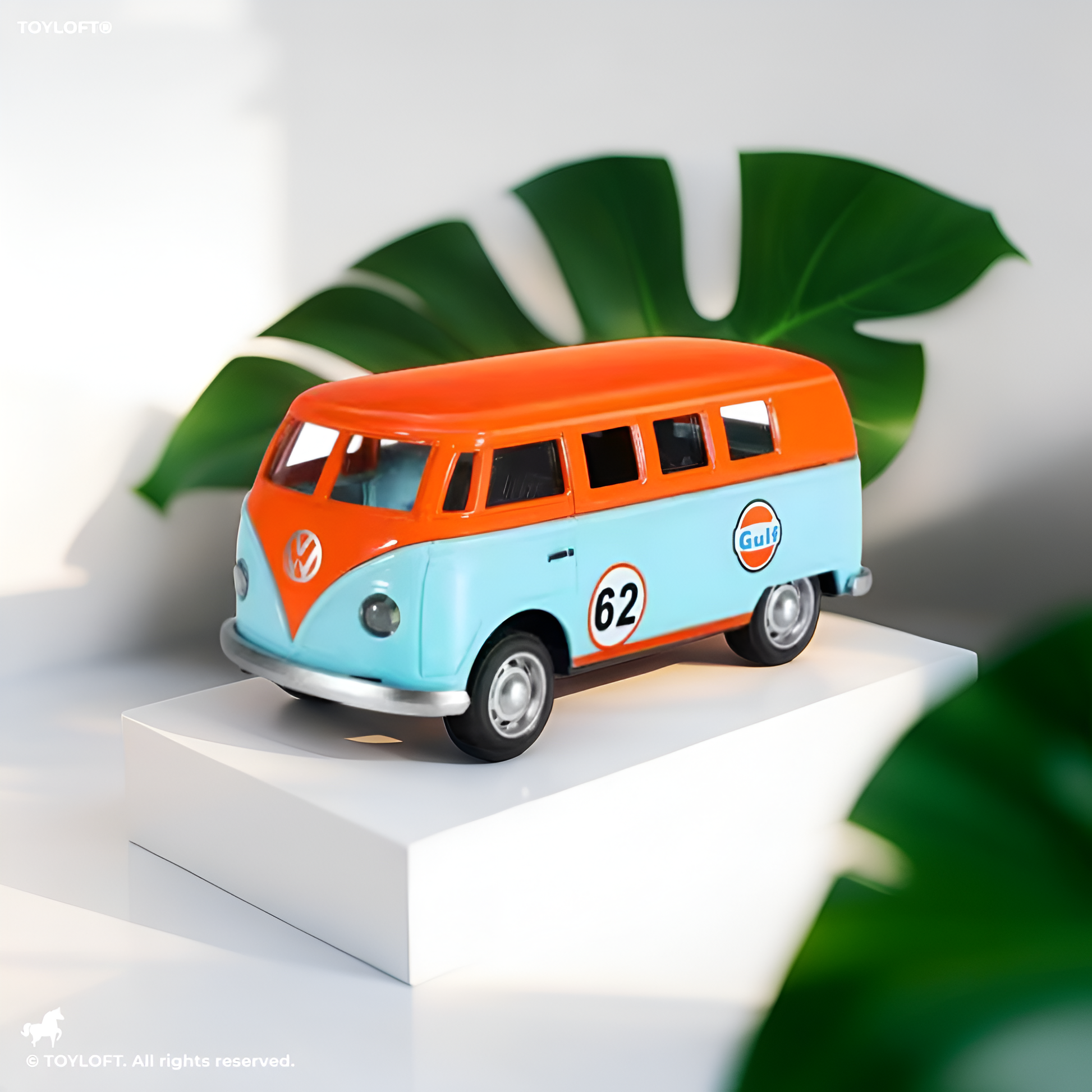 Volkswagen T1 Classic Bus Diecast Metal Toy Car - Gulf Livery - Pull Back Action with Lights & Sound - Scale 1/32.